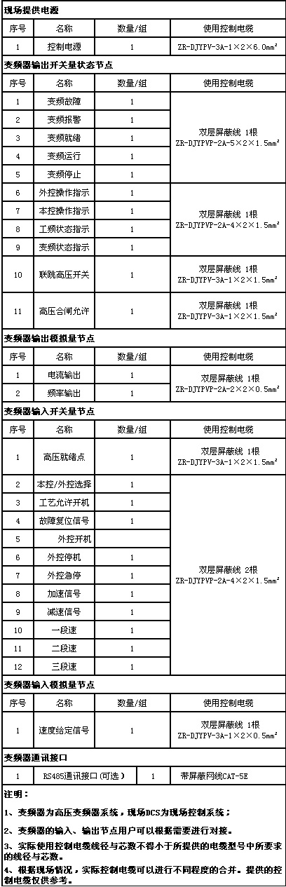 功率電纜的選型必須嚴(yán)格按照以下要求選型:電纜的載流量;電纜制造廠家的規(guī)范;安裝敷設(shè)的方式;電纜長(zhǎng)度引起的壓降;符合電力行業(yè)規(guī)范;符合EMC規(guī)范。另變頻器與用戶(hù)設(shè)備(高壓電源柜、電機(jī))之間的高壓電纜建議采用有屏蔽作用的鎧裝電纜(防止鼠害;滿足EMC要求)。