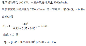 采取風(fēng)門調(diào)節(jié)風(fēng)量時(shí)風(fēng)機(jī)所需的軸功率為401kW,變頻器調(diào)風(fēng)量時(shí)相對(duì)調(diào)節(jié)風(fēng)門調(diào)風(fēng)量的節(jié)電率為0.364。