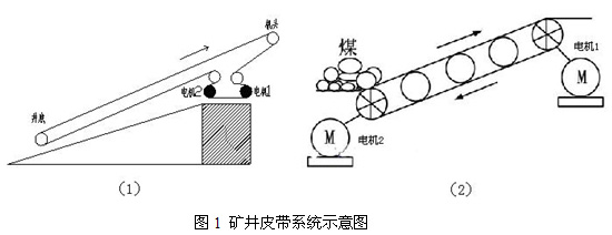 (2)卸完煤后的空皮帶經(jīng)過一個轉(zhuǎn)向輪,分別通過1#電機(jī)拖動的主動滾筒,和2#電機(jī)拖動的從動滾筒后,皮帶在經(jīng)過一個導(dǎo)向輪運(yùn)行到井底完成一次運(yùn)煤過程。
