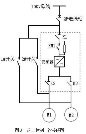 現(xiàn)場采用一套山東新風(fēng)光電子科技發(fā)展有限公司生產(chǎn)的JD-BP38-710P高壓變頻調(diào)速系統(tǒng),額定電壓10kV,額定電流51A,額定功率710kW,采用“一拖二”控制方案,主回路控制接線如圖3所示: