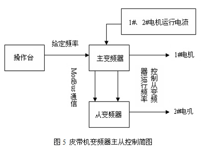 對于兩機(jī)驅(qū)動的皮帶機(jī)變頻控制,為了有效實現(xiàn)電機(jī)的負(fù)載平衡控制,高壓變頻調(diào)速系統(tǒng)適宜采用主-從方式進(jìn)行控制。現(xiàn)場采用2臺450kW變頻器分別控制2臺400kW高壓電機(jī),如圖5所示,選用1#變頻器為主變頻器,2#變頻器為從變頻器,由操作臺發(fā)給主變頻器給定頻率值,主從變頻器之間采用ModBus總線通信,1#變頻器作為主控,檢測1#和2#電機(jī)的運(yùn)行電流,發(fā)出輸出轉(zhuǎn)矩給定值,控制2#從變頻調(diào)速系統(tǒng)同步運(yùn)行。
