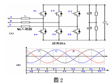 電機(jī)一般工作在電動(dòng)狀態(tài)下,逆變塊A作為整流用,在發(fā)電狀態(tài)下,作為逆變回饋用,電機(jī)發(fā)電時(shí),通過逆變塊B中IGBT反并聯(lián)的二極管整流,整流電壓加在母線電容C上,如果發(fā)電功率較大時(shí),母線電壓就會(huì)上升,直接威脅到整個(gè)系統(tǒng)的安全,這樣就需要啟動(dòng)逆變塊A將多余的能量經(jīng)過電感電容回饋到電網(wǎng)。電感將承受直流母線電壓和電網(wǎng)線電壓的差值,同時(shí)電感將緩沖諧波的無功功率。
