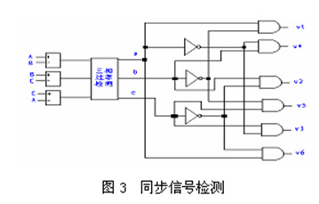 設(shè)定逆變塊A中的功率器件的開關(guān)狀態(tài)要求與電網(wǎng)同步,同步信號(hào)如圖2中(B)所示,下面是一種簡單的同步信號(hào)控制方式,可以簡單的得到V1-V6的同步方波脈沖。