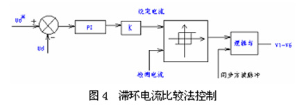 回饋制動(dòng)時(shí),回饋電流變化速度較快,就需要采用有效的控制方式,一般采用滯環(huán)電流比較法控制,見如下框圖4所示: