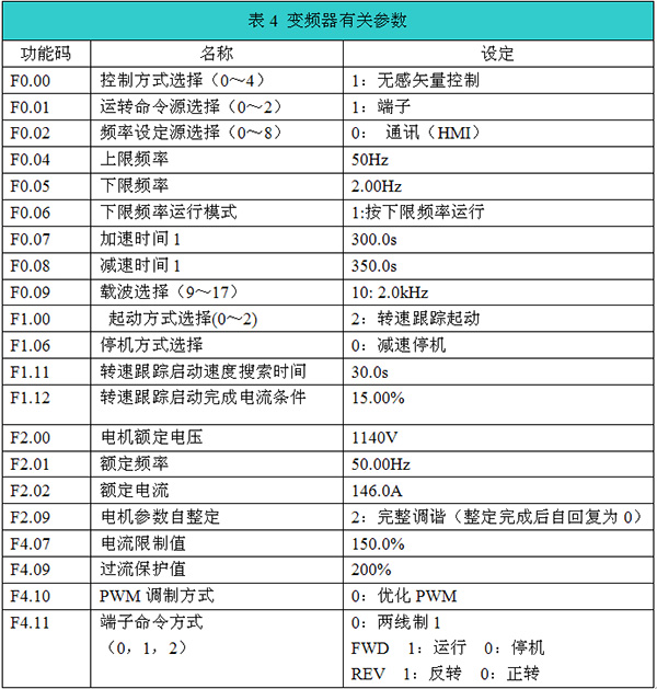 (3)變頻器有關(guān)參數(shù)設(shè)置如表4所示。