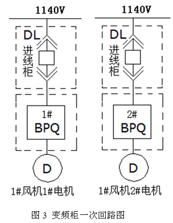 正興煤業(yè)九鑫礦主扇風(fēng)機(jī)為兩臺(tái),一用一備。風(fēng)機(jī)電機(jī)變頻器采用一拖一控制,風(fēng)光中壓變頻調(diào)速系統(tǒng)由一次回路進(jìn)線柜、變頻單元柜組成。變頻運(yùn)行時(shí),變頻器為電機(jī)提供全面的保護(hù)。如果變頻器在運(yùn)行中出現(xiàn)故障,立即將備用風(fēng)機(jī)投入運(yùn)行,保證煤礦通風(fēng)生產(chǎn)要求。1#風(fēng)機(jī)中壓變頻器柜一次回路如圖3所示。