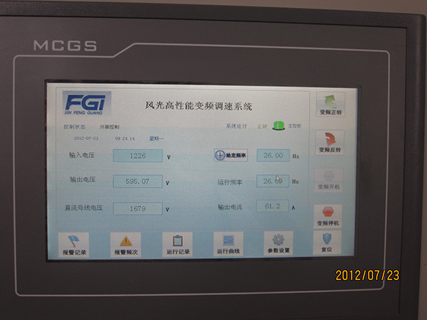 正興煤業(yè)九鑫礦主扇風(fēng)機(jī)選用型號(hào)JD-BP34-270F風(fēng)光變頻器4套,于2012年7月2日一次性投運(yùn)成功。變頻運(yùn)行后,風(fēng)門全部打開,運(yùn)行頻率26Hz左右,不僅完全滿足煤礦生產(chǎn)工藝要求,而且用戶操作非常方便。變頻器運(yùn)行穩(wěn)定。變頻器現(xiàn)場運(yùn)行如圖4所示,人機(jī)界面運(yùn)行如圖5所示,變頻器運(yùn)行參數(shù)記錄如表5所示。