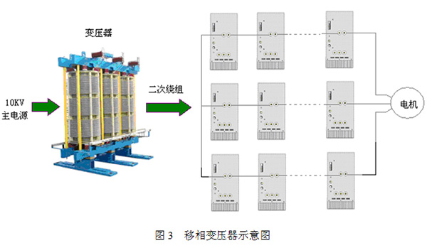 移相變壓器的原理:將高壓電源變換為副邊相互絕緣的多組低壓,各副邊繞組在繞制時(shí)采用延邊三角形的接法,相互之間有一定的相位差。移相變壓器示意圖如圖3所示。