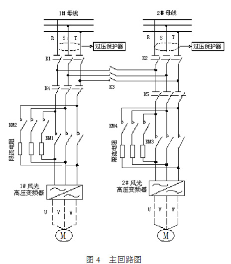 此系統(tǒng)采用雙回路電源供電,1#母線與2#母線分別來(lái)自兩個(gè)不同的變壓器電源。K3為母線聯(lián)絡(luò)刀閘,當(dāng)1#或者2#電源其中任何一路電源斷電的情況下,K3刀閘閉合,使得1#、2#變頻器供電電源正常。K1、K2為兩臺(tái)高壓隔離開關(guān),為確保1#、2#電源不發(fā)生短路,K1、K2、K3采用電磁互鎖操動(dòng)機(jī)構(gòu),實(shí)現(xiàn)電磁和機(jī)械互鎖。K4、K5為兩臺(tái)高壓隔離開關(guān),分別向1#、2#變頻器供電。K1、K4閉合,K2、K3、K5斷開,1#母線供電,1#變頻器運(yùn)行;K1、K3、K4斷開,K2、K5閉合,2#母線供電,2#變頻器運(yùn)行。