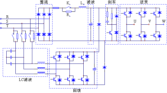 修井機要求變頻器四象限運行,對于產(chǎn)生的再生能量要求變頻器配有回饋單元進行處理,變頻器主回路結(jié)構(gòu)如圖1所示。
