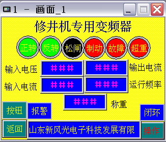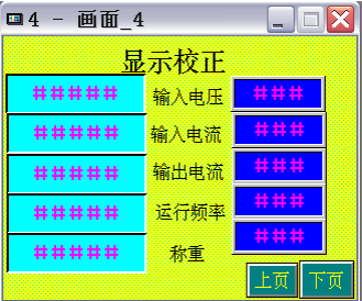 (1)觸摸屏共四個畫面:第一面如圖3所示,上面具有正轉(zhuǎn)指示、反轉(zhuǎn)指示、松閘指示、制動報警指示、故障指示、超重指示。電壓顯示,輸入電流顯示,輸出電流顯示,頻率顯示,重量顯示。按鈕/面板是用按鈕操作還是觸摸屏操作的選擇鍵。報警/靜音用來故障聲音報警,開環(huán)/閉環(huán)用來超重限制開機,按操作鍵進入第二畫面,如圖4所示。根據(jù)文字提示可進行相應(yīng)操作。第三畫面是時間和日期,如圖5所示。按下頁鍵進入第四畫面,如圖6所示,第四畫面是顯示校正。