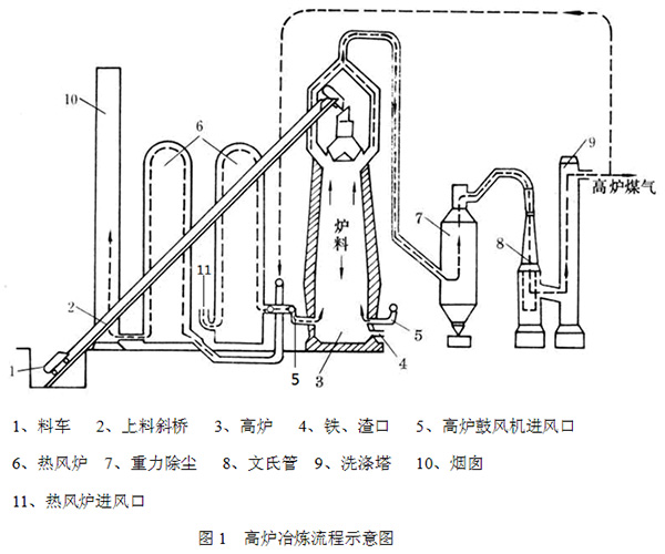 高爐因具有煉鐵技術(shù)經(jīng)濟(jì)指標(biāo)良好,工藝簡(jiǎn)單,生產(chǎn)量大,勞動(dòng)生產(chǎn)效率高,能耗低等優(yōu)點(diǎn),這種方法生產(chǎn)的鐵占世界鐵總產(chǎn)量的絕大部分。高爐為煉鐵環(huán)節(jié)中最主要的設(shè)備之一,它為橫斷面為圓形的煉鐵豎爐,生產(chǎn)時(shí)從爐頂裝入鐵礦石、焦炭、造渣用熔劑(石灰石),從位于爐子下部的風(fēng)口吹入經(jīng)預(yù)熱的空氣。在高溫下焦炭中的碳同鼓入空氣中的氧燃燒生成的一氧化碳和氫氣,在爐內(nèi)上升過(guò)程中除去鐵礦石中的氧,從而還原得到鐵。鐵水從鐵口放出,生成的爐渣,從渣口排出。煤氣從爐頂排出,作為熱風(fēng)爐、加熱爐、焦?fàn)t、鍋爐等燃料。