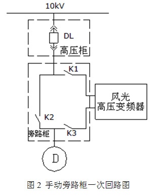 圖2旁路柜中,共有3個(gè)高壓隔離開(kāi)關(guān),為了確保不向變頻器輸出端反送電,K2與K3采用電磁互鎖操動(dòng)機(jī)構(gòu),實(shí)現(xiàn)電磁互鎖。當(dāng)K1、K3閉合,K2斷開(kāi)時(shí),電機(jī)變頻運(yùn)行;當(dāng)K1、K3斷開(kāi),K2閉合時(shí),電機(jī)工頻運(yùn)行,此時(shí)變頻器從高壓中隔離出來(lái),便于檢修、維護(hù)和調(diào)試。