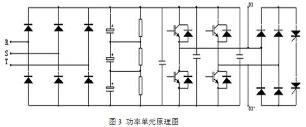 ?。?)30個(gè)功率單元結(jié)構(gòu)上完全一致,可以互換,其電路結(jié)構(gòu)如圖3所示,為基本的交 - 直 - 交單相逆變電路,整流側(cè)為二極管實(shí)現(xiàn)三相全波整流,通過(guò)對(duì) IGBT 逆變橋進(jìn)行正弦 PWM 控制。每個(gè)功率單元完全一樣,可以互換,這不但調(diào)試、維修方便,而且備份也十分經(jīng)濟(jì)。假如一個(gè)功率單元發(fā)生故障,該單元的輸出端能自動(dòng)旁路而整機(jī)可以正常運(yùn)行。