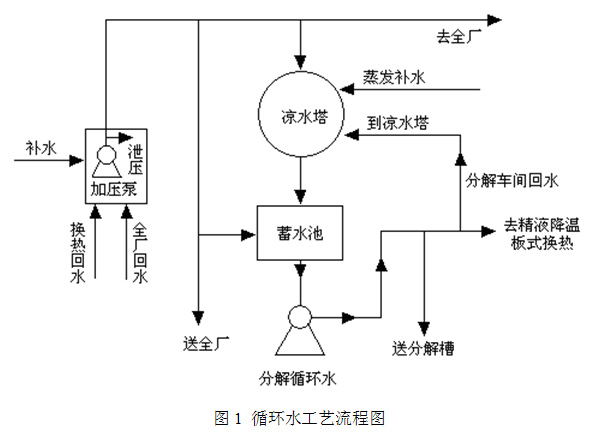 循環(huán)水泵主要負(fù)責(zé)分解槽的板式換熱和精液降溫,并為分解槽和立下軟水系統(tǒng),真空泵系統(tǒng)提供用水。通過涼水換熱后的回水進(jìn)行降溫重新利用。循環(huán)水工藝流程如圖1所示。