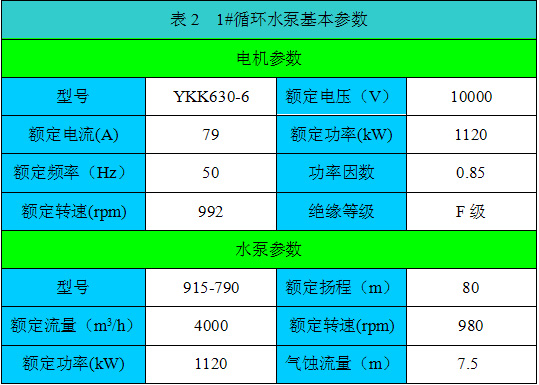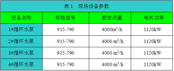 循環(huán)水泵房配置4臺(tái)完全相同的循環(huán)泵,根據(jù)生產(chǎn)需要添加或減少投入的水泵數(shù)量。設(shè)備詳細(xì)參數(shù)如表1、表2所示。