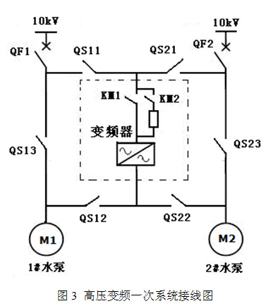 氧化鋁循環(huán)水泵系統(tǒng)變頻改造采用1#、2#水泵共用一套高壓變頻器,3#、4#水泵共用一套高壓變頻器。高壓變頻器采用一拖二手動(dòng)旁路方案,即配備兩臺(tái)高壓變頻器。以1#、2#水泵為例說明其控制思路,其一次系統(tǒng)接線圖路如圖3所示,通過切換高壓隔離開關(guān)把高壓變頻器切換到要運(yùn)行的水泵上去。如圖所示高壓變頻器可以拖動(dòng)1#給水泵電動(dòng)機(jī)實(shí)現(xiàn)變頻運(yùn)行,也可以通過切換拖動(dòng)2#給水泵電動(dòng)機(jī)實(shí)現(xiàn)變頻運(yùn)行。兩側(cè)給水泵電動(dòng)機(jī)均具備工頻旁路功能。