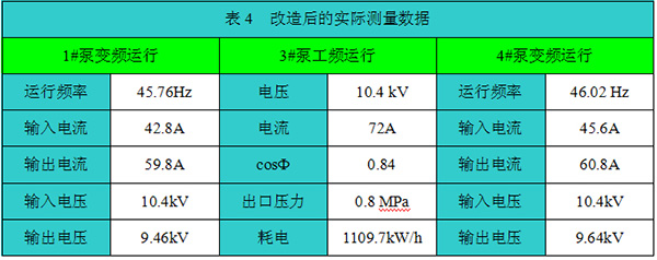 循環(huán)水泵變頻改造后,2011年6月,兩套高壓變頻器一次性投入生產(chǎn),至今運(yùn)行正常。經(jīng)過廠節(jié)能服務(wù)中心測(cè)試,系統(tǒng)達(dá)到了預(yù)期的效果。水泵變頻改造后,循環(huán)水泵輸入電流有明顯下降,設(shè)備實(shí)現(xiàn)了軟起動(dòng),改善了設(shè)備的運(yùn)行工況,極大地減輕了設(shè)備起動(dòng)時(shí)對(duì)供配電系統(tǒng)的沖擊。改造后的實(shí)際測(cè)量數(shù)據(jù)如表4所示。