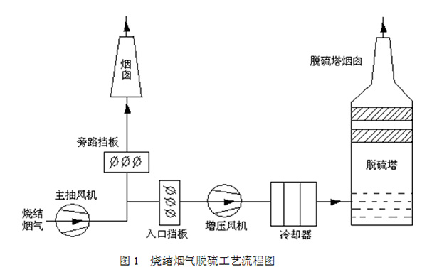 來自燒結(jié)廠引風機的煙氣,經(jīng)增壓風機增壓后進入冷卻器。在冷卻器中,原煙氣被工業(yè)水和來自吸收塔的漿液冷卻,然后煙氣以一定壓力導(dǎo)入吸收塔進行反應(yīng),凈化后的煙氣從脫硫塔煙囪排出。脫硫塔將吸收后的SO2通過相關(guān)裝置轉(zhuǎn)化為硫酸鈣,并排出至指定位置。