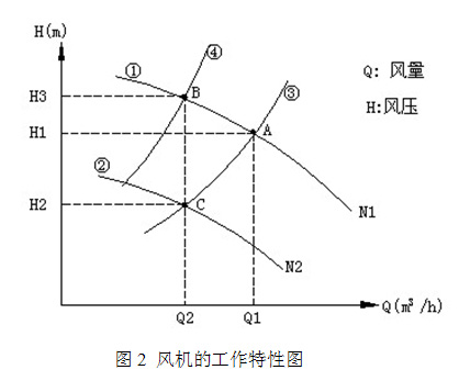 曲線①為風機按轉(zhuǎn)速N1工作時的特性曲線,曲線②為風機按轉(zhuǎn)速N2工作時的特性曲線,③④為風道阻力曲線。