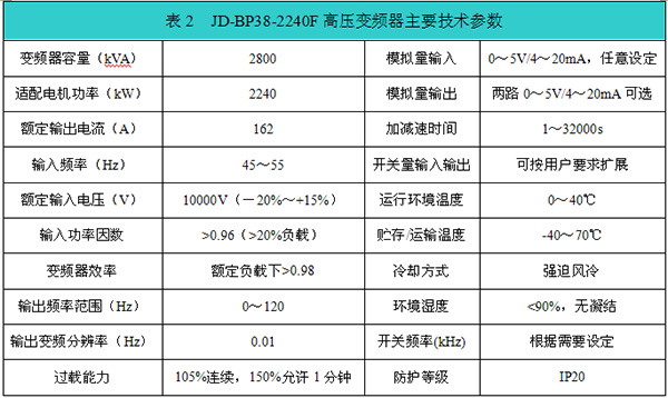 風光牌高壓變頻器為高--高電壓源型模式,由移相變壓器,功率單元和控制器組成。JD-BP38-2240F高壓變頻器采用48脈沖整流,功率單元每相采用8個功率單元串接組成,三相共24個單元;輸出相電壓為17電平,輸出線電壓33電平,功率單元旁路單元采用可控硅作為旁路器件,不降額運行??刂破鞑糠忠愿咚傥⑻幚砥鲗崿F(xiàn)控制以及與子微處理器間進行通信。風光高壓變頻器采用模塊化設(shè)計,互換性好、維修簡單。JD-BP38-2240F高壓變頻器主要技術(shù)參數(shù)如表2所示。