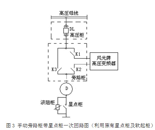 燒結(jié)廠脫硫增壓風機原配置帶星點柜配置液阻啟動柜,本次改造保留原有星點柜和液阻柜保持不變。需要將星點柜斷路器的一組常開點引至變頻器。需要變頻拖動電機時,液阻柜按原控制方式啟動。即上級高壓開關(guān)柜給變頻器送電后,液阻柜得到開關(guān)柜閉合狀態(tài)信號后就啟動。星點柜閉合后,變頻器檢測到閉合信號后方具備開機條件,然后根據(jù)實際情況給變頻器啟動信號,進行變頻運行。工頻運行時,閉合K3,液阻柜按原先工頻方式啟動,完成星點柜和液阻柜的啟動,達到電機軟啟動。