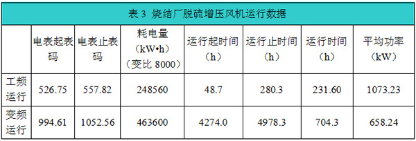在燒結(jié)產(chǎn)量基本相同的情況下,煉鐵廠節(jié)能服務(wù)中心對增壓風機正常運行時參數(shù)實際測量如表3所示。增壓風機工頻運行,電機實際功率1073.23kW;增壓風機變頻運行,電機實際功率658.24kW;電機功率減小414.99kW。按照增壓風機年運行小時數(shù)為7000h,年節(jié)省電量大約為290.493萬kW·h,電價按照0.30元/kW·h計,則一臺增壓風機變頻改造的收益為871499元。