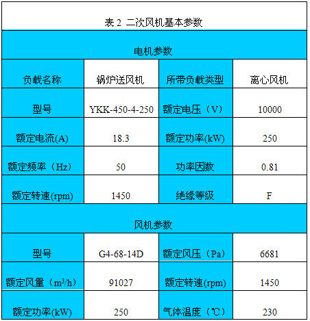 表1為現(xiàn)場一次風(fēng)機基本參數(shù),表2為現(xiàn)場二次風(fēng)機基本參數(shù)。