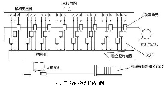 每個功率單元結(jié)構(gòu)上完全一致,可以互換,為基本的交-直-交單相逆變電路,整流側(cè)為六支二極管實現(xiàn)三相全橋整流,通過對IGBT逆變橋進行正弦PWM控制,開關(guān)器件采用1700V的IGBT。而低壓變頻技術(shù)目前已經(jīng)非常成熟,因此變頻單元的可靠性極高。