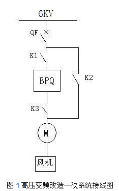 改造前:原系統(tǒng)6kV高壓開(kāi)關(guān)柜至電機(jī),電機(jī)與風(fēng)機(jī)直接連接,通過(guò)風(fēng)門(mén)擋板的開(kāi)度來(lái)調(diào)節(jié)流量。