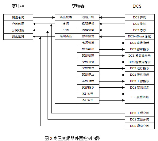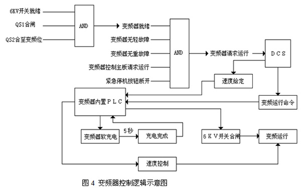 如圖4所示,當(dāng)所有開(kāi)機(jī)條件都具備后,DCS發(fā)出變頻運(yùn)行命令,變頻器內(nèi)置PLC發(fā)出“合閘”信號(hào)至6kV高壓柜,現(xiàn)場(chǎng)6kV小車(chē)開(kāi)關(guān)合閘,變頻器進(jìn)行軟充電,5S后充電完成,變頻器處于就緒狀態(tài),由DCS給出4-20mA信號(hào)控制變頻器頻率來(lái)改變電機(jī)轉(zhuǎn)速。