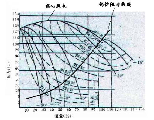 圖1所示為300MW火電機(jī)組引風(fēng)機(jī)性能曲線示意圖,該風(fēng)機(jī)為離心式,進(jìn)口導(dǎo)葉調(diào)節(jié)風(fēng)量,圖中0o 為調(diào)節(jié)門全開(kāi)位置,負(fù)值為調(diào)節(jié)門向關(guān)閉方向轉(zhuǎn)動(dòng)的角度;圖中虛線為等效率線。離心式風(fēng)機(jī)的最高效率在進(jìn)口調(diào)節(jié)門的最大開(kāi)度處,等效率線和鍋爐阻力曲線接近垂直,效率沿阻力線迅速下降。