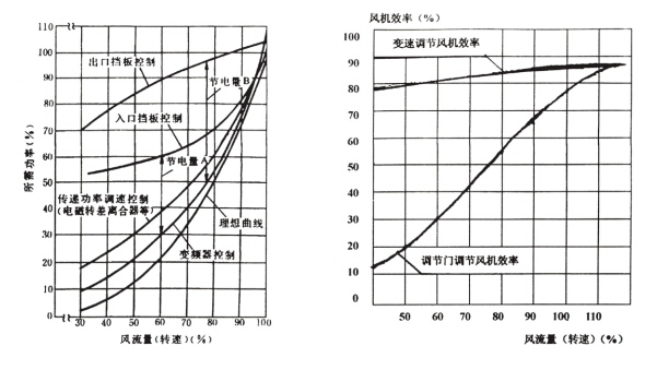 圖2離心式風(fēng)機(jī)不同調(diào)節(jié)方式耗電特性比較 圖3不同調(diào)節(jié)方式下的風(fēng)機(jī)效率