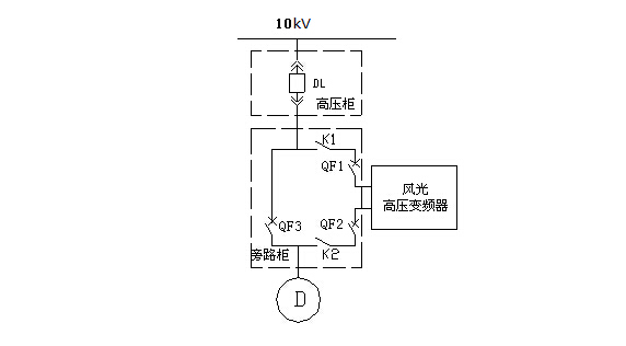 旁路柜主要配置:三個(gè)真空斷路器(QF1、QF2、QF3)和兩個(gè)刀閘隔離開(kāi)關(guān)K1、K2。QF2與QF3實(shí)現(xiàn)電氣互鎖,當(dāng)QF1、QF2閉合,QF3斷開(kāi)時(shí),電機(jī)變頻運(yùn)行;當(dāng)QF1、QF2斷開(kāi),QF3閉合時(shí),電機(jī)工頻運(yùn)行。另外,QF1閉合時(shí),K1操作手柄被鎖死,不能操作;QF2閉合時(shí),K2操作手柄被鎖死,不能操作?!?br/>電機(jī)工頻運(yùn)行時(shí),若需對(duì)變頻器進(jìn)行故障處理或維護(hù),切記在QF1、QF2分閘狀態(tài)下,將隔離刀閘K1和K2斷開(kāi)。
