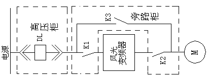 手動旁路中,共有3個高壓隔離開關(guān)K1、K2、K3,當(dāng)K1、K2閉合,K3斷開時,6kV電源經(jīng)隔離刀閘K1到高壓變頻裝置,變頻裝置輸出經(jīng)K2送至電動機(jī),電動機(jī)變頻運行;一旦變頻裝置出現(xiàn)故障,可斷開隔離刀閘K1、K2,合上K3,在工頻電源下啟動電機(jī)運行,此時變頻器從高壓中隔離出來,便于檢修、維護(hù)和調(diào)試。隔離刀閘K1、K2、K3之間具有閉鎖和防止誤操作功能。