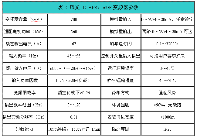 鄒平齊星開發(fā)區(qū)熱電有限公司6號機(jī)(155MW)排粉風(fēng)機(jī)改造選用風(fēng)光JD-BP37-560F高壓變頻器2臺、并配置手動旁路柜,用于變頻/工頻切換。采用“一拖一”變頻控制。風(fēng)光JD-BP37-560F變頻器參數(shù)如表2所示。