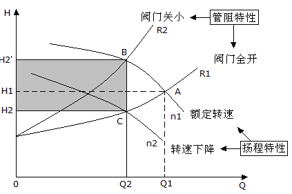 更直觀的水泵工作曲線圖見圖1:水泵的正常工作點為A,當水量需要從Q1調(diào)到Q2時,采用閥門調(diào)節(jié),管網(wǎng)特性曲線由R1(閥門全開)改變?yōu)镽2(閥門關(guān)?。?,其工作點調(diào)至B點,其功率為OQ2BH2’所圍成的面積,其功率變化很小,而其效率卻隨之降低。當采用變頻調(diào)速時,可以按需要升降電機轉(zhuǎn)速,改變設(shè)備的性能曲線,圖中從n1(額定轉(zhuǎn)速)到n2(轉(zhuǎn)速下降),其工作點調(diào)至C點,使其參數(shù)滿足工藝要求,其功率為OQ2CH2所圍成的面積,同時其效率曲線也隨之平移,依然工作在高效區(qū)。圖中陰影部分為實際節(jié)約能耗。