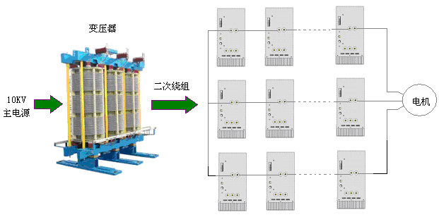 采用直接高壓變頻電路結(jié)構(gòu),功率單元多重化連接,直接輸出到高壓電機,提供驅(qū)動電壓。從物理結(jié)構(gòu)上分為控制柜,功率柜,變壓器柜三大部分,根據(jù)現(xiàn)場工藝要求還可選配旁路柜、上位機、遠控盒,產(chǎn)品外形如圖2所示。
