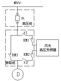 旁路柜主要配置:三個真空接觸器(KM1、KM2、KM3)和兩個刀閘隔離開關(guān)K1、K2。KM2與KM3實現(xiàn)電氣互鎖,當KM1、KM2閉合,KM3斷開時,電機變頻運行;當KM1、KM2斷開,KM3閉合時,電機工頻運行。另外,KM1閉合時,K1操作手柄被鎖死,不能操作;KM2閉合時,K2操作手柄被鎖死,不能操作。