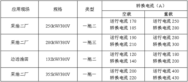 我們公司在青海油田應(yīng)用了幾套大功率一拖多的控制柜,從調(diào)試的情況看,轉(zhuǎn)換效果都比較理想。現(xiàn)將轉(zhuǎn)換試驗的效果列出表格,如下: