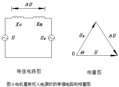 從圖4和圖5中可以看出,瞬間斷開(kāi)電源后,電機(jī)感應(yīng)電壓有所衰減,同時(shí)感應(yīng)電壓與工頻電源電壓的相位已開(kāi)始拉開(kāi),不同時(shí)刻投入工頻電源,將會(huì)產(chǎn)生不同的△U。圖6是電機(jī)重新投入電源時(shí)的等值電路和相量圖。