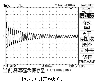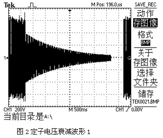 三相電動(dòng)機(jī)正常運(yùn)行時(shí),以同步轉(zhuǎn)速旋轉(zhuǎn)的主磁場(chǎng)在定子三相繞組內(nèi)感應(yīng)對(duì)稱的三相電動(dòng)勢(shì)。若斷開(kāi)電源后,主磁場(chǎng)消失,但曾經(jīng)被主磁場(chǎng)磁化的轉(zhuǎn)子鐵芯依然存在剩磁,與此同時(shí)由于慣性轉(zhuǎn)子依然高速旋轉(zhuǎn),在定子線圈產(chǎn)生的感應(yīng)電動(dòng)勢(shì)并不會(huì)在極短的時(shí)間內(nèi)消失,只是有所衰減。圖2是一37KW電機(jī)兩相之間,在斷開(kāi)變頻器輸出前、后的的定子繞組的電壓波形,由此可看出,斷開(kāi)電源后定子線圈的感應(yīng)電動(dòng)勢(shì)逐漸衰減的過(guò)程。圖3是圖2的展開(kāi),仔細(xì)觀察該圖可以看出,隨著轉(zhuǎn)速的降低,轉(zhuǎn)子繞組電壓頻率也在緩慢的下降。