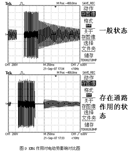 KM4作用對(duì)電動(dòng)勢(shì)影響對(duì)比圖。由圖9可以看出,KM4提供通路的作用時(shí)間約為300ms,作用后該時(shí)刻與一般狀態(tài)同一時(shí)刻的感應(yīng)電動(dòng)勢(shì)幅值相比幅值小了很多。適當(dāng)控制KM4的作用時(shí)間,讓其幅值減小到額定電壓的三分之一以下就可以了。這樣,即使切換至工頻電源時(shí)刻感應(yīng)電動(dòng)勢(shì)與工頻電源的相位相差180°,△U也不會(huì)超出其許可的安全范圍了。在KM4的作用過(guò)程中,會(huì)加快電機(jī)的轉(zhuǎn)速下降,但通過(guò)試驗(yàn)得知,KM4的作用對(duì)電機(jī)轉(zhuǎn)速的影響比對(duì)感應(yīng)電動(dòng)勢(shì)幅值的影響要顯得多。