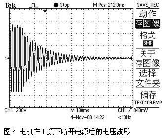 由于變頻器輸出的是PWM波,其相位不易觀察,測(cè)得在工頻狀態(tài)下的電壓波形進(jìn)行進(jìn)一步的分析。因?yàn)樽冾l器50Hz時(shí)的輸出電壓與工頻電壓作用在電機(jī)上基本時(shí)等效的,并不影響分析結(jié)果。圖4是一2.2KW電機(jī)在工頻電源下突然斷開(kāi)電源后的電壓波形圖,由該圖可以看出,電壓波形沒(méi)有跳變,所以斷開(kāi)瞬間感應(yīng)電動(dòng)勢(shì)與電源電壓是同相位的,其幅值也是基本相等的。隨著剩磁的慢慢消失,電壓幅值逐漸降低,同時(shí)伴隨著轉(zhuǎn)速的降低感應(yīng)電動(dòng)勢(shì)的頻率逐漸下降,其相位也逐漸與電源相位拉開(kāi)。頻率越低,單位時(shí)間內(nèi)拉開(kāi)的相位差也就越大。