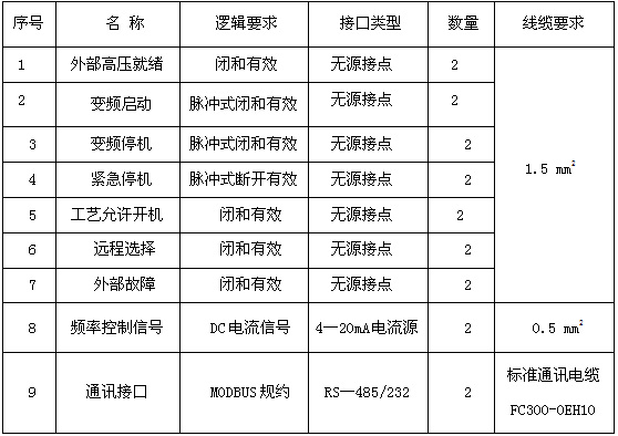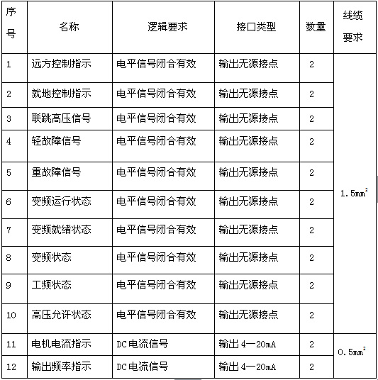 ?。?)外部高壓就緒,故障輸出,報(bào)警輸出,就地指示,遠(yuǎn)程指示,變頻指示,工頻指示,遠(yuǎn)程急停,遠(yuǎn)程開(kāi)機(jī),遠(yuǎn)程停機(jī),遠(yuǎn)程頻率給定,電流輸出,頻率輸出,工藝允許,聯(lián)跳外部高壓等。