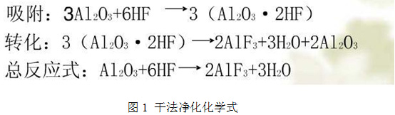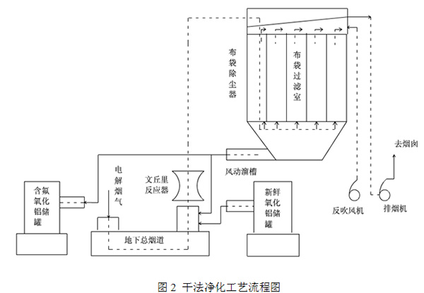 ?。?)吸附反應(yīng)。將吸附劑新鮮的氧化鋁粉加入到電解煙氣中,并使之與煙氣充分接觸而吸附煙氣中的氟化氫,然后送到布袋除塵器袋濾室。