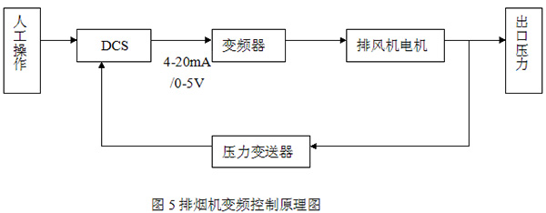 如圖5所示,檢測(cè)排煙風(fēng)機(jī)出口煙氣壓力,因?yàn)楫?dāng)內(nèi)外壓差太大時(shí),布袋除塵器中的煙氣沒(méi)有被除掉,就被直接吸出,影響凈化效果。為了保證煙氣凈化過(guò)程順暢進(jìn)行,DCS接受壓力變送器傳輸過(guò)來(lái)的壓力信號(hào),按照既定算法進(jìn)行計(jì)算。當(dāng)壓力超過(guò)系統(tǒng)設(shè)定值時(shí),DCS發(fā)出4-20mA或0-5V的信號(hào)來(lái)降低變頻器的頻率,實(shí)現(xiàn)排風(fēng)機(jī)降速運(yùn)行來(lái)降低出口煙氣壓力;當(dāng)壓力低于系統(tǒng)設(shè)定值時(shí),DCS發(fā)出4-20mA或0-5V的信號(hào)來(lái)升高變頻器的頻率,實(shí)現(xiàn)排風(fēng)機(jī)升速運(yùn)行來(lái)升高出口煙氣壓力。