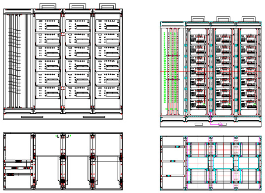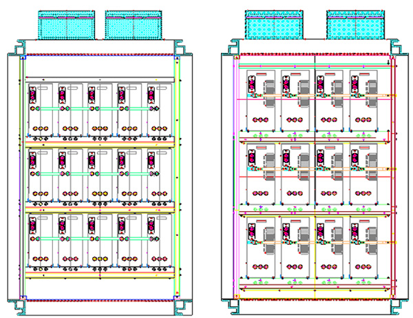 隨著高壓變頻器市場規(guī)模的不斷擴(kuò)大,用戶對變頻的苛求也越來越嚴(yán)格。作為產(chǎn)品開發(fā)商,也不斷為提升產(chǎn)品質(zhì)量與檔次作著不懈努力,所用柜體也由原來的單一種類向更寬范方向發(fā)展,其產(chǎn)品功能、質(zhì)量與外形都在不斷升級(jí)。同規(guī)格變頻器原體積如圖(4)。其單元結(jié)構(gòu)排布也有了更新的認(rèn)知,由于原來每相豎排所用電纜多、結(jié)構(gòu)復(fù)雜、附加成本大,便改為每相單元橫排,使變壓器次級(jí)引線分別對應(yīng)A、B、C三相,不再有接線柜,直接通過電纜托板到達(dá)各單元,不再迂回,其控制柜也由原來的600mm轉(zhuǎn)為400mm。另一個(gè)飛躍則是每相單元數(shù)量的減少,如10kV改為8單元/相,6kV改為5單元/相。功率單元數(shù)量少了,其整機(jī)質(zhì)量并沒有受到影響,相反其故障點(diǎn)卻相應(yīng)減少,加之電路結(jié)構(gòu)上星點(diǎn)漂移技術(shù)的應(yīng)用,使得變頻器性能更加優(yōu)越。功率柜具體排布情況,6kV5個(gè)單元,每相橫向分布,上、中、下三相如圖(5)所示。10kV如果采取單元前后放置,每相前4后4,如圖(6)所示: