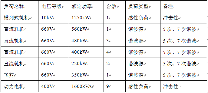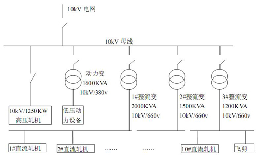 現(xiàn)場(chǎng)主要負(fù)荷是1臺(tái)1250kW/10kV橫列式軋鋼機(jī)和數(shù)臺(tái)不同功率等級(jí)的低壓直流軋機(jī),以及生產(chǎn)線上運(yùn)動(dòng)部件的低壓交流驅(qū)動(dòng)電機(jī)。