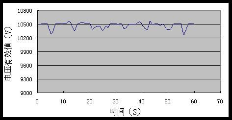 FGSVG運(yùn)行后無(wú)功功率補(bǔ)償效果非常理想,系統(tǒng)側(cè)平均功率因數(shù)穩(wěn)定在0.94以上,系統(tǒng)側(cè)的無(wú)功功率降低到500kvar以下,如圖4。FGSVG投運(yùn)后對(duì)沖擊性無(wú)功功率快速補(bǔ)償,有效的抑制了電網(wǎng)電壓的閃變,電網(wǎng)電壓最大波動(dòng)200V,基本穩(wěn)定在10500V附近,保證了用電設(shè)備的安全運(yùn)行,如圖5。